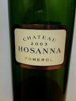 Hosanna 2003 Merlot 80%, Cabernet Franc 20% 90RP bjuder in med sin enormt fina färg. En tät kärna och början till utvecklad lite brunaktig kant. Stor bra, lite choklad fruktig doft möter en till att börja med. Andra aromer kommer efterhand, körsbär, köttigt, tungt vin och multna löv. Smaken känns smal, inte särskilt inbjudande, lite knuten, lite ceder, järn, fat och torr frukt.